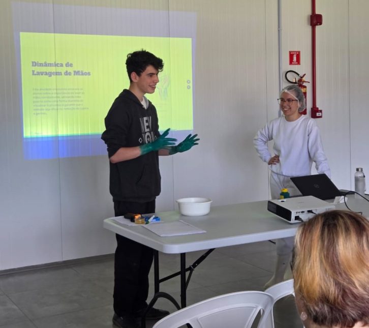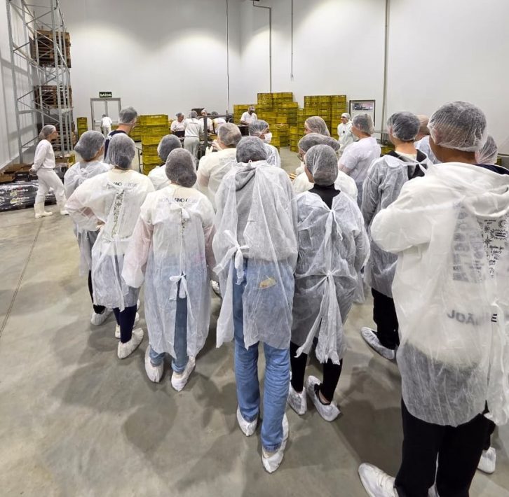 A programação iniciou com uma palestra da Responsável Técnica (RT) da empresa, Betiana de Souza Zabot, que abordou as boas práticas de fabricação. Em seguida, os alunos receberam Equipamentos de Proteção Individual (EPI) – aventais, toucas e propés descartáveis – para conhecer as instalações da agroindústria com segurança.