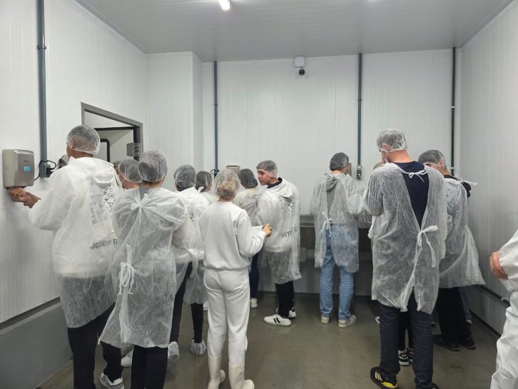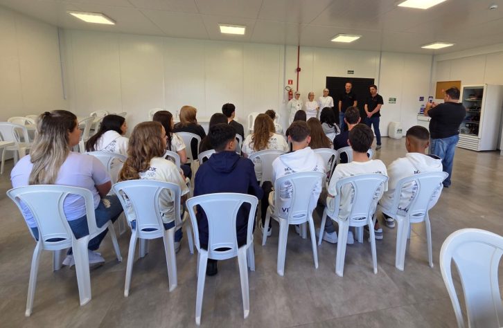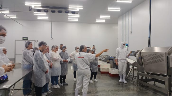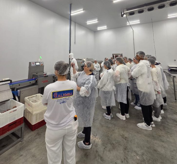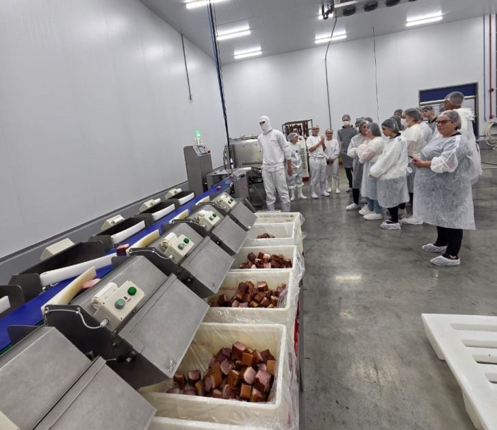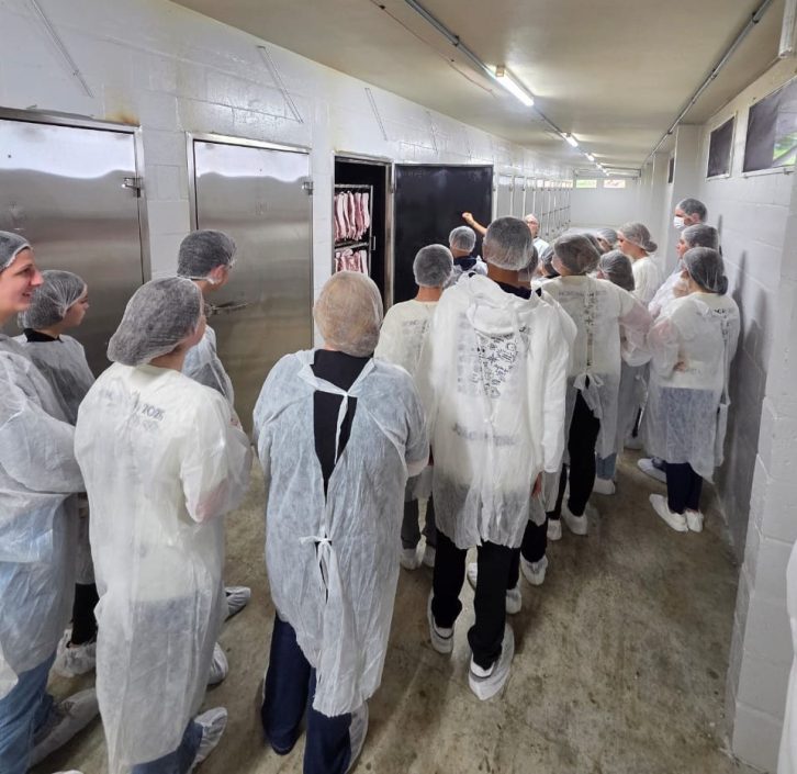 Durante a visita, os estudantes conheceram a estrutura da planta industrial e acompanharam o fluxo de produção, desde a recepção da matéria-prima até a expedição, passando por etapas do processamento de bacon e linguiça mista.
