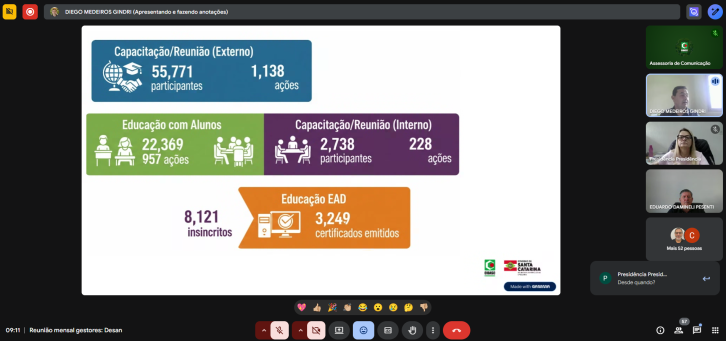A presidente da Companhia Integrada de Desenvolvimento Agrícola de Santa Catarina (Cidasc), Celles Regina de Matos, conduziu, nesta terça-feira (21/10), a reunião mensal on-line com os gestores regionais da empresa. O encontro teve como pauta principal o alinhamento institucional e a apresentação da execução das metas dos gestores estaduais e regionais, quanto ao desempenho em Educação Sanitária (Desan).