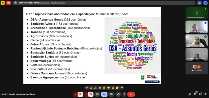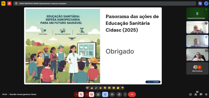 Durante a reunião, o gestor do Desan, Diego Gindri, apresentou um panorama das ações desenvolvidas ao longo de 2025 e as perspectivas para o próximo ano. O departamento completou um ano de criação, consolidando-se como uma área estratégica para fortalecer o vínculo entre a defesa agropecuária e a sociedade catarinense por meio da educação e sensibilização sanitária.