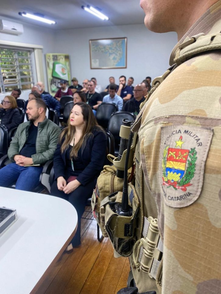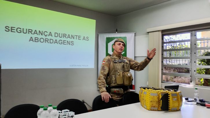 A Companhia Integrada de Desenvolvimento Agrícola de Santa Catarina (Cidasc), Departamento Regional de Caçador, promoveu no dia 21 de outubro um treinamento voltado à Semana Interna de Prevenção de Acidentes de Trabalho (Sipat), com o tema “Segurança nas Abordagens”. A instrução foi ministrada pelo subtenente Alan Diego Pickler, com apoio do 3º sargento Luiz Carlos Soares da Silveira, cabo Willian Zaias e cabo Dionei Ribeiro de Oliveira, todos do 15º Batalhão de Polícia Militar de Caçador.