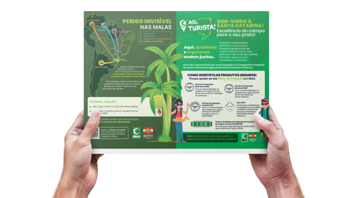 O material entregue traz o mote “Alô, turista! Você pode ajudar a evitar a entrada de pragas e doenças agropecuárias”, e reforça que pequenas atitudes fazem grande diferença na proteção do agronegócio catarinense.