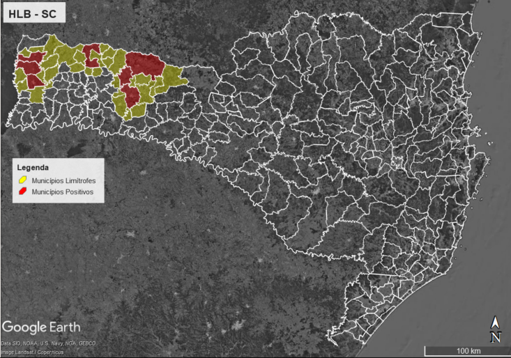 “As inspeções também apontaram diagnósticos positivos para “Ca. Liberibacter asiaticus” nos municípios catarinenses de Abelardo Luz e São Domingos.”